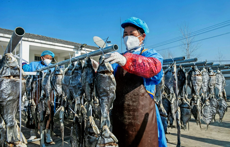 1月13日,安徽省含山县安徽吴楚生物科技有限公司内一片忙碌,工人们正忙着腌制、晾晒封扁鱼。入冬以来,该公司加大生产力度,赶制这一传统非遗美食,备足年货满足市场需求。
